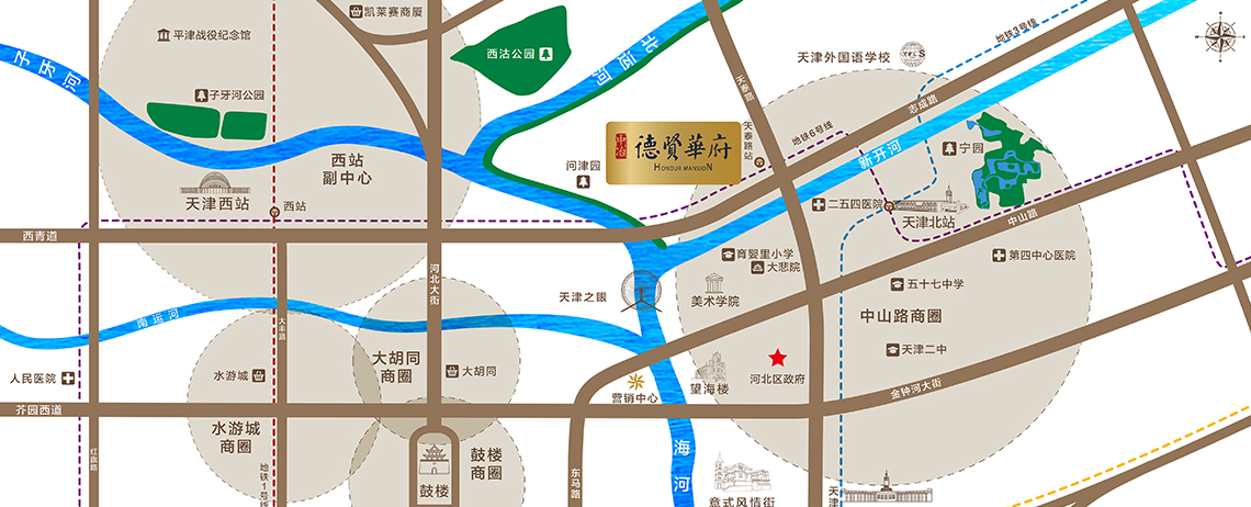 交通公交:小王庄站:50米;安定里站:300米;东于庄站:500米;天津外国语学校:700,米;西于庄:900米;二五四医院:900米;芳草园:950米地铁:经社区地下直达6号线天泰路站自驾:西青道快速路,通往西青、红桥;志成路快速,通往河东、北辰;天泰路,通往河北、北辰,天津市区通往北京的重要道路;河北大街:通往红桥、南开;红桥北大街,通往红桥。学校:育婴里小学、五十七中学、天津第二中学、外院附校、天津美术学院、河北工业大学综合商场:中山路商圈、万福广场、西站商圈、大胡同商圈、鼓楼商圈、水游城商圈医院:二五四医院、天津第四中心医院银行:中国工商银行、中国建设银行、中国农业银行、中国民生银行、光大银行、中国银行公园:西沽公园、北宁公园、天津之眼、大悲院、古文化街小区内部配套:信报箱、商业街